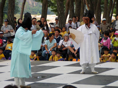 In another scene, the yangban (aristocrat) and the scholar argue over who is the more learned, which is exactly what you see them doing here. The scholar is on the left in blue, and the yangban is on the right.