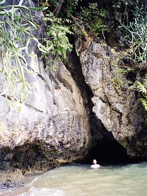 After a light lunch and some rest, we went swimming off a tiny beach. The waves rolled in rather large—this picture caught a lull in the waves. I did go into the sea cave behind me, but there were so many mosquitoes hiding in there that I quickly came back out again.
