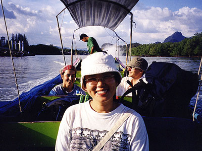 This is the longtail boat that we rode in for our tour of the bay. Here we have just left the dock and are on our way to the Muslim fishing village of Ko Payni, where we will spend the night. Behind Hyun-jin is a Hungarian couple who went with us. They were very nice people, and fun to talk to.