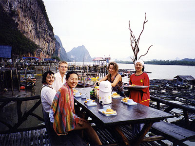 Breakfast is served the next morning at the fishing village. Sitting on the right side of the table is a Swiss woman who had taken the tour the previous day, and was ending with the night at the fishing village (the tours were staggered, starting both in the morning and in the afternoon). The woman standing was our host, the owner of the bungalow in the next picture.