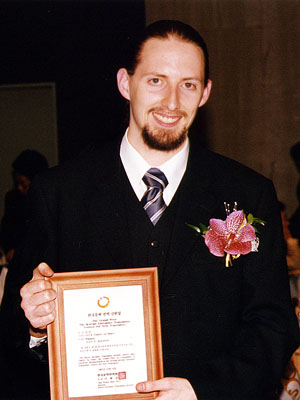 Here I am with my award plaque. I’m grinning like a goon mainly because the whole speech thing is over, and now we can actually eat dinner.