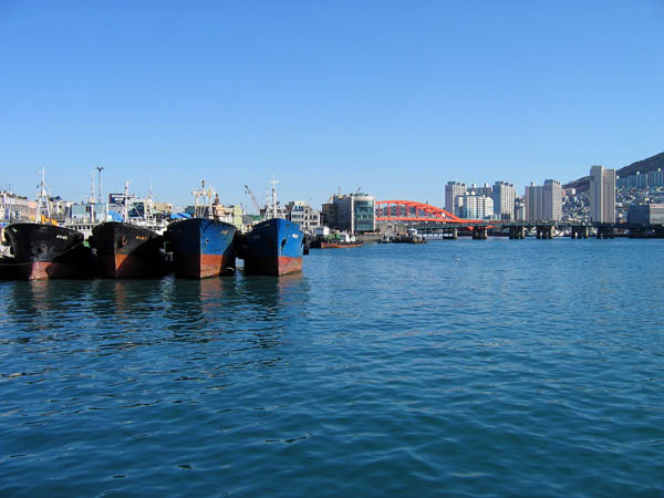 This photo was taken from the same spot as the previous photo—I just swiveled left a few degrees (you should be able to recognize some of the buildings and the bridge). I liked the way the ships sat there next to each other.
