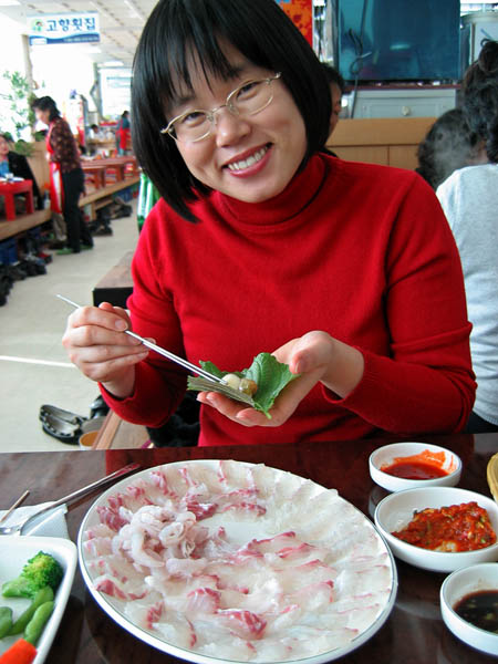 Hyunjin samples the main course, a plate of ureok (sorry, I don’t know what this is in English). She is wrapping it in a sesame leaf with a slice of garlic and (I believe) some soy bean paste. I usually just eat my sashimi straight, maybe dipped in a mixture of soy sauce and wasabi, but Koreans like wrapping stuff in greens.