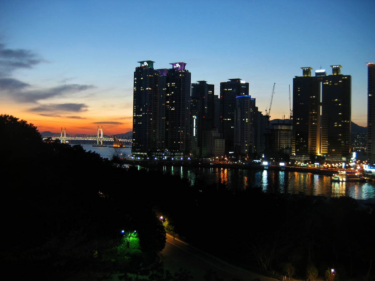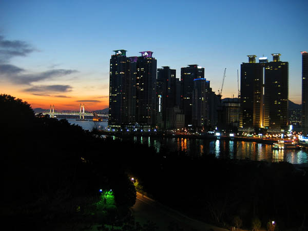 This is the view from our hotel room. On the left you can see the bridge from the previous photo, now lit up for the coming night.