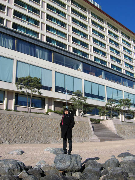 Hyunjin balances on a rock in front of the hotel. The first row of windows you can see on the bottom is actually a bath house and a swimming pool. We woke up early in the morning to use the pool, and there were only a few other people there at the time. The third row of windows from the bottom, where you can see some chairs on tables on the right of the picture, is the lounge area where we enjoyed free drinks and snacks in the evening and a breakfast buffet in the morning.