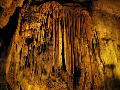 More draperies hanging down from flowstone overhangs, but these extend much farther than most others we had seen. They are also free hanging, and they look like sword blades hanging down from the ceiling.