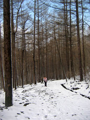 Not too much farther along, the snow began to cover the trail as well. Here we are nearing the Cheondong Rest Area, which is about four kilometers from the start of the trail and two-thirds of the way to Biro Peak. Hyunjin was already starting to feel the climb, and the extra care required to tread through the snow didn’t help. Yet at this point I was still optimistic. After all, there was only a few centimeters of snow on the trail, and if it continued like this we wouldn’t have any problems. Of course, I had never hiked Mt. Sobaek before, so I had no idea what lay ahead.