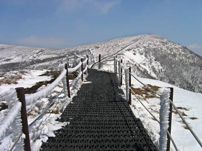 There was a lot less snow on the ridge, but only because the wind blew it all away. There is no way to actually show wind in a photo, but this shot should give you an idea of how windy it was up there—so windy that the snow was blown sideways onto the posts. Not only was I glad we brought warm clothing, but I was glad that our windbreakers had hoods. My ears would have fallen off after about a minute in that wind.