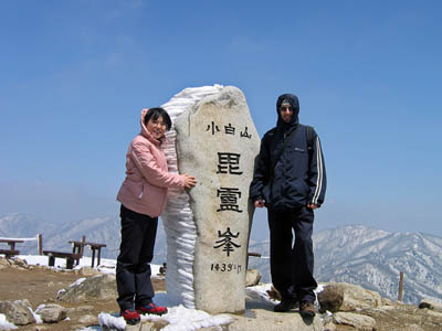 We finally made it! Again you can see how the wind blew the snow onto one side of the monument. It reads: “Mt. Sobaek, Biro Peak, 1439.5 meters.” This is the summit of Mt. Sobaek, so we didn’t feel the need to go any further. And we didn’t spend too much time hanging around either. The wind was so strong that we basically looked around for about thirty seconds and said, “OK, let’s go.” After all, it’s the journey that counts, not the destination, right?