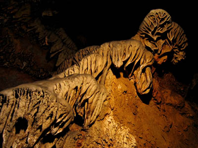 More draperies, these flowing down from canopies that climb upward and outward from the cave wall. Seen from below, I thought they resembled a clawed hand reaching out.
