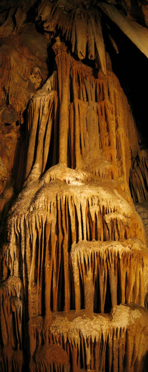 I stitched together two photographs to get this tall view. It is, like almost all other cave formations both here and in Ondal Cave, a flowstone formation. The small pillars are draperies that have flowed down and joined together, ending at tiers formed by drip splash. New draperies form from these canopies and the process continues until the floor is reached.