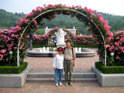 The first place we visited was the Rose Garden. Here Hyunjin’s mom and dad pose in front of a rose-covered arch.