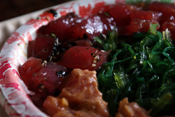 This was HJ’s choice, tuna poke (pronounced “po-kay”). It’s basically chunks of raw tuna marinated in various sauces with vinegared seawood on white rice, and it’s really good. Raw tuna is a thing of beauty on it’s own, but the sauces—such as soy sauce and wasabi—raise it to another level. Needless to say, HJ loved this.