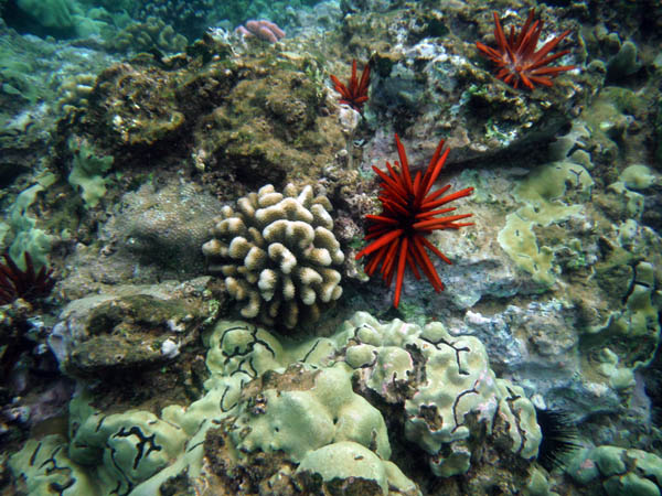 Most of the coral appeared to be bleached and dead, but there were splashes of color below the surface, especially these red things that were scattered here and there. I have no idea what they are, but they are pretty.