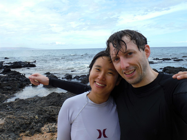 Here we are, out of the water. You can see the ocean behind us where we were snorkeling—notice how rough the water is. We were quite tired when we were finished.