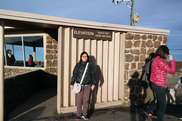Here’s HJ at the peak, 3,055 meters above sea level. Before we got here, when we were still on the other side looking across, there was a Japanese tour group huddled here, all dressed in blue windbreakers and looking very much like a colony of penguins huddled against the wind and cold.