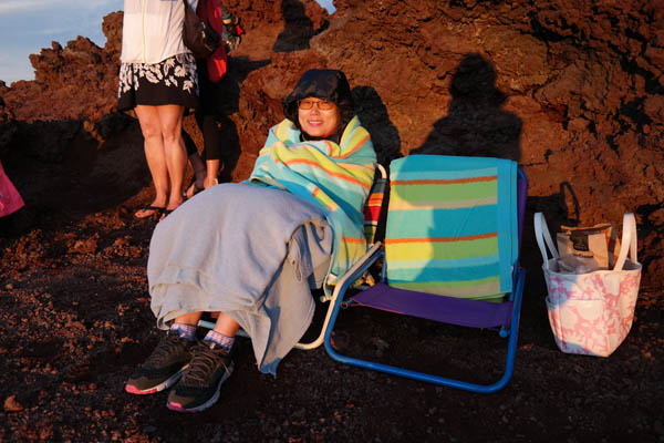 These are our beach chairs, with our supplies in that bag and HJ bundled up against the cold. It might not look that cold, especially with that woman in the background wearing shorts, but it was quite chilly and windy. At one point a young Korean couple who were apparently on their honeymoon (you can tell) drove up and got out of their car wearing (matching) shorts and T-shirts. They hopped around for a while—obviously freezing—before getting back in their car and driving down again, not even staying for the sunset. Noobs.