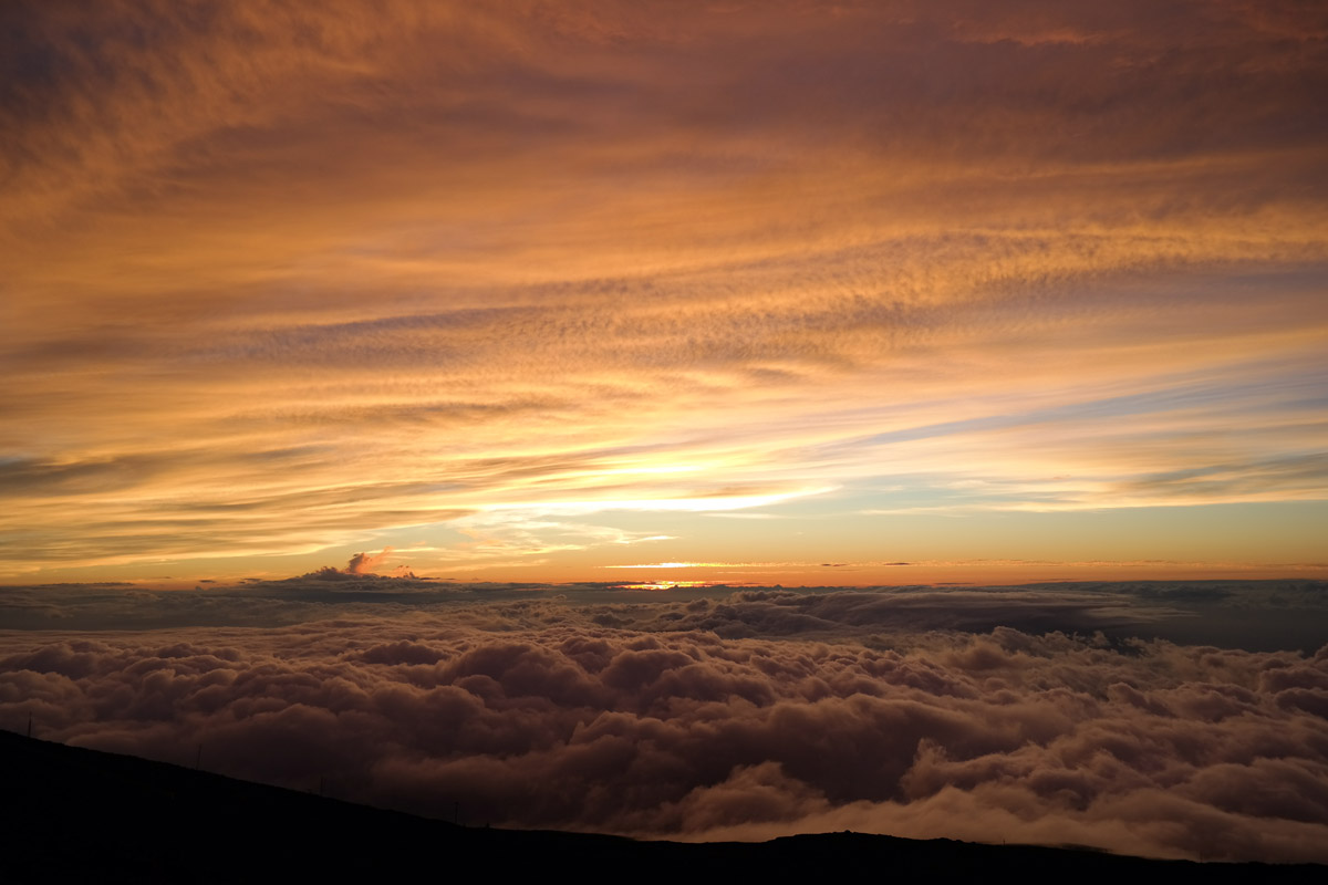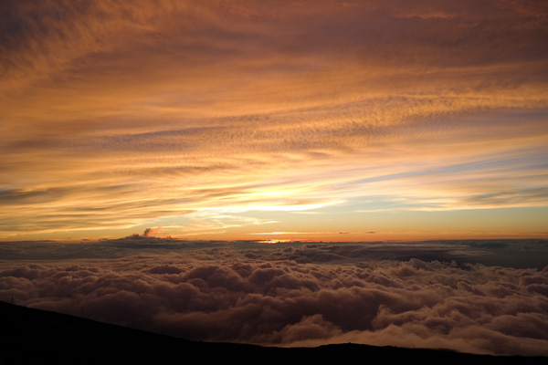 The awesome thing about the summit of Haleakala is how you can look up and down at the clouds. The clouds right below the summit looked like a frothing ocean, and it was quite an experience to see the sun set into them.