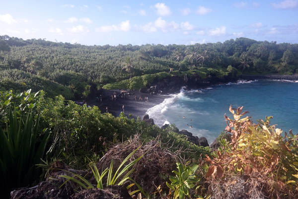 Our last real stop on our tour around the island was Waianapanapa State Park, at the northern end of Hana and just south of Hana Airport. The black sand beach is one of the attractions there, but we were tired after the long trip and contented ourselves with looking at it from a distance.