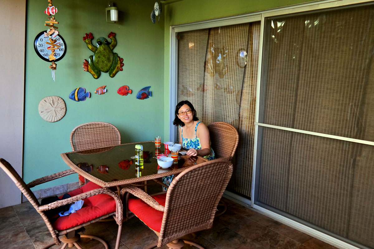 The next day the weather had improved considerably, allowing us to have our breakfast of yoghurt and muesli on our really nice porch. We ended up eating every meal that we prepared at the condo here because it was such a lovely space. It was open, but it also felt like our own space.