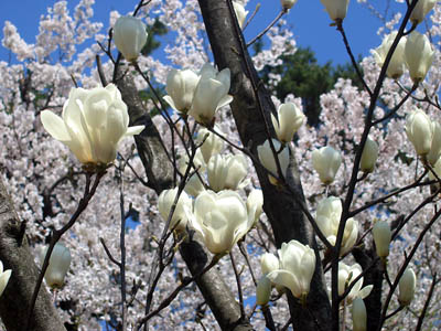 Some magnolias against cherry blossoms in the background. I actually didn’t know that these were magnolias. I looked up the Korean name in the dictionary and thought, “Ah, so that’s what magnolias look like.” That may sound a bit odd, but I wasn’t too knowledgeable about flowers in the States, and Korean is kind of a first language for me when it comes to flower names (among other things).