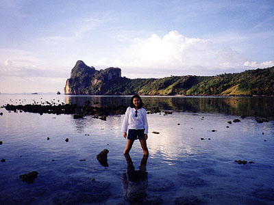On the evening of our last night on the island we walked way out into the harbor, picking our way among the now-exposed growths of coral and the hordes of tiny crabs crawling across the sand and through the shallow waters. At high tide Hyun-jin would be swimming where she is standing now.