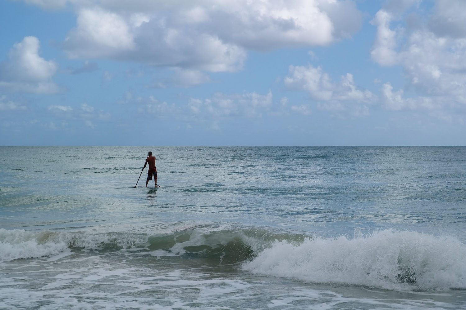 I arrived in Miami on Monday afternoon, but it wasn’t until Tuesday that my sightseeing began in earnest. It began to rain pretty heavily while I was on the MetroMover to the bus terminal, but on the bus over to Miami Beach the rain began to let up. It was still sprinkling a little when I arrived, but it soon stopped. Perhaps it was that, combined with the fact that it was a weekday morning, but the beach was nearly deserted. There were people in the water, though, including this intrepid surfer who paddled out to catch waves and then surf them back in.