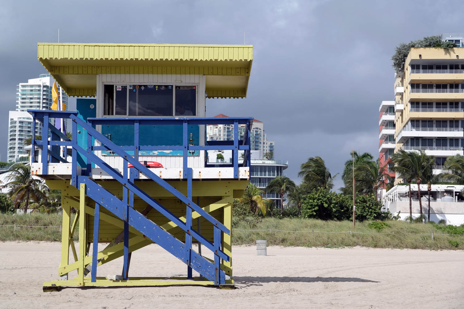 The beach was dotted with lifeguard huts, all painted in lively colors and all manned; if you look closely, you can see the lifeguard here behind the rightmost section of the window.