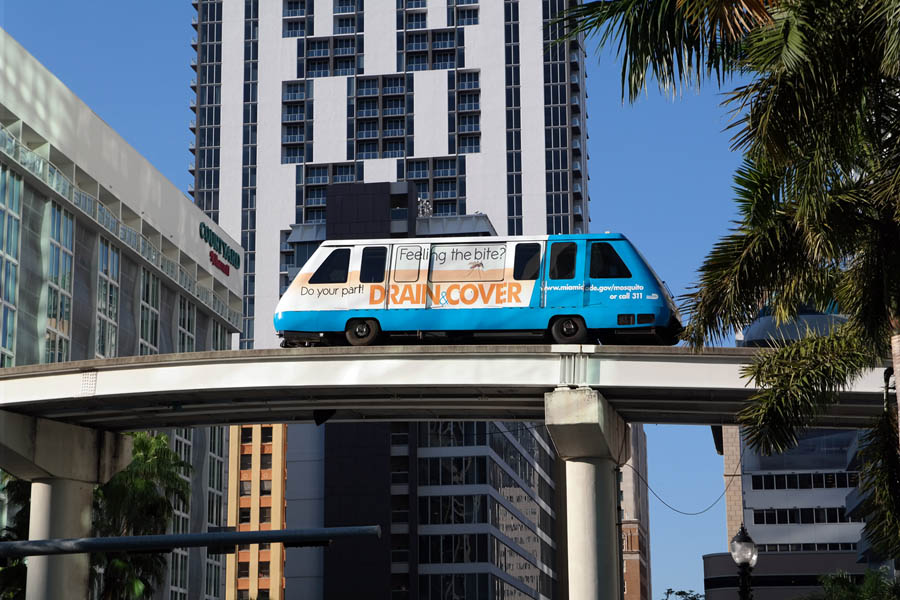 This is a MetroMover tram. I wanted to get a photo of one, and when I saw this one approaching I quickly whipped up my camera and managed to get this shot. Only when I was looking at my photographs later did I realize that I captured a snapshot of current events, namely the Zika virus scare.