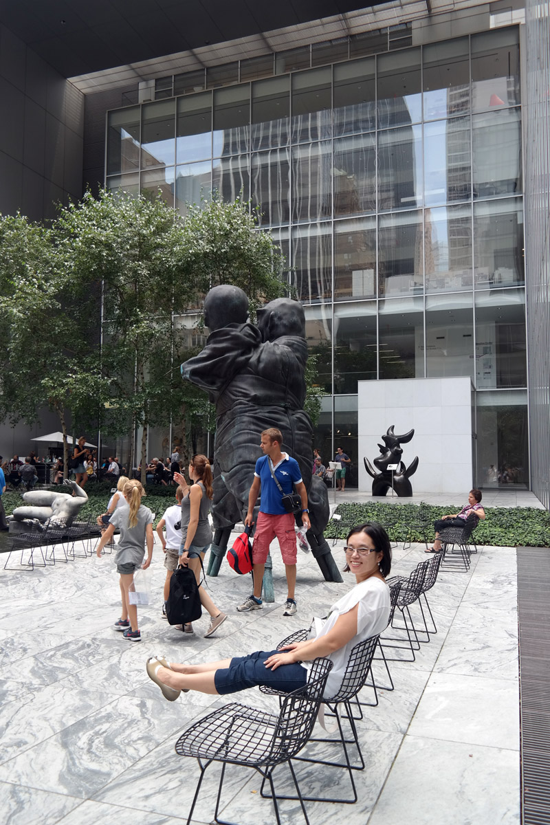 Here is HJ stretching out her legs in the sculpture park at MOMA. The weather wasn’t the best that day (as you can see from the earlier photos), and it rained off and on, but at least it wasn’t raining when we decided to chill out here for a little while.