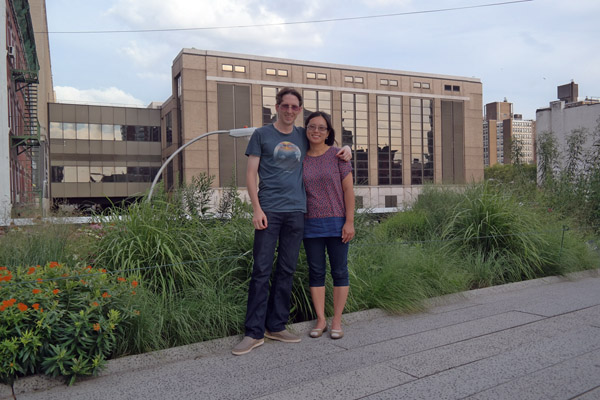 We made one more trip to the High Line before finishing up our two-day stay in New York. This is somewhere near the northern end, I think; we had brought our gorilla tripod along, so we set the camera up for this relatively rare shot of us together.