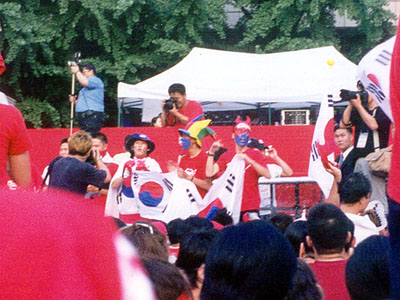Although a lot of people had various symbols painted on their faces (yours truly included), these guys went the whole way. They quickly found their way to the front of the crowd and jumped up and down quite a bit. There were a lot of fans like this, actually. Some brought extra large flags, some painted their faces, and some brought homemade signs. I don't think I've ever seen a more enthusiasic crowd.