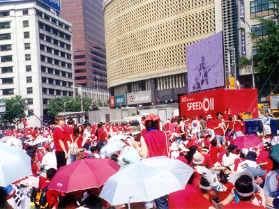 “Speed 011” is a cell phone company, and they were the official sponsors of the Red Devils. Before the tournament got underway I was intrigued by their decision to support a cheering squad, but after I saw the Red Devils in action, I realized that it was a very smart business decision. Anyway, the downside for us was that we had to sit through the same Speed 011 commercials blasted over and over at inhuman volumes. Of course, it ended up being nothing compared to the noise of the crowd once the match started.