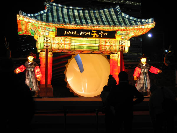This gate served as the introduction to the festival. It is a rather elaborate design modeled after a traditional Korean gate, and the sign plate reads, “2010 Seoul World Lantern Festival.” That large circle of light that you can see through the base of the gate as actually the bottom of a large sculpture that stands at the entrance of Cheonggyecheon. It looks a bit like a conch shell or soft-serve ice cream, although I’ve heard it called other things as well.