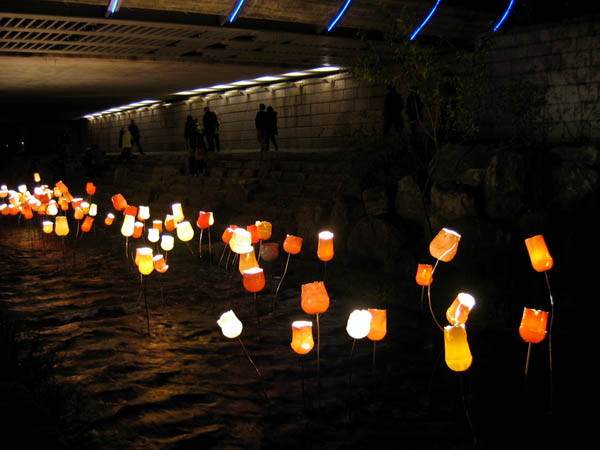 This was one of the last photos we took before we left the festival. Not all of the lanterns were large, lavish constructions, and installations of smaller lanterns like these had their own charm. As I originally wrote when I first posted this photo: “These in particular looked lovely above the flowing water and reminded me a little of lotus flowers.”