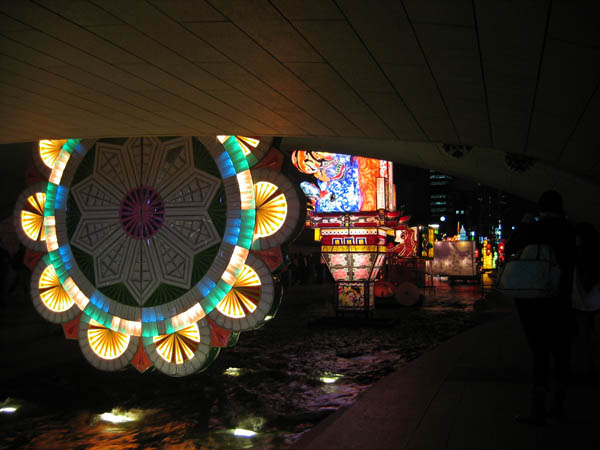 I took this photo beneath the first bridge that runs over Cheonggyecheon. It should give you an idea of how the lanterns were set up along the stream. The only reason this photo is in the gallery, though, is because the large wheel-like lantern in the foreground on the left burned down a couple days after we visited, so I thought I would include at least one photo of it. News reports said that police had not determined why the lantern burned down, but... well, I mean, you’ve got large paper structures filled with electric lights. I’m guessing there was a short or some other electrical fault.