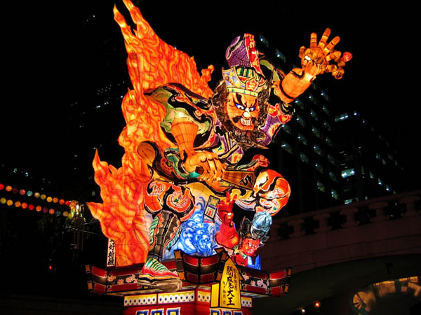 Once on the north side, we made our way back the way we had come to see this colorful lantern (you can see the rear of this lantern in the background of the “wheel of misfortune” photo earlier, and the wheel itself is visible in the lower right of this photo). The large characters on the yellow sign at the bottom say “kakuma daiou” in Japanese and “gak-ma dae-wang” in Korean. I tried to look up this figure, but couldn’t find anything about it. The “ma” character, though, means “demon,” and the last two characters mean “great king,” so it’s a safe bet to say that this is some sort of king of demons. (The first character means “tower” or “pavilion,” but I’m not sure how that works into this.)