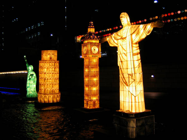 Here are some familiar sights. From right to left: Cristo Redentor (Christ the Redeemer), Rio de Janiero; Big Ben, London; the Leaning Tower of Pisa; and the Statue of Liberty, New York.