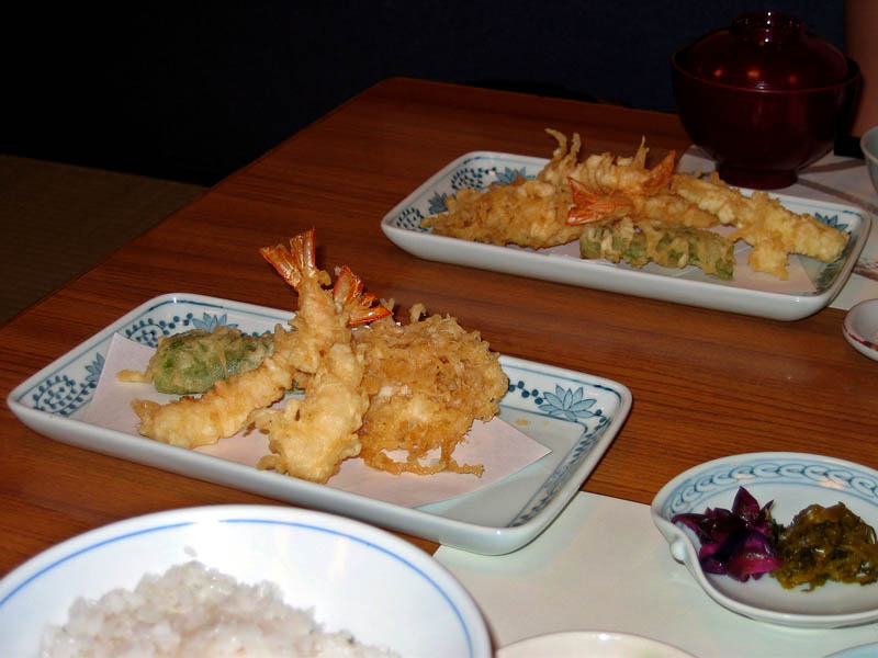 After leaving the bakery we headed toward Shinjuku, where we wandered around for a while trying to figure out where to eat dinner. We found this tempura place that looked pretty good, and despite the fact that the menu was a bit difficult to figure out, we managed to order a selection of tempura with rice. Pictured here is the first of many rounds of batter-fried food. It was all very good, but if I had to do it over again I would have ordered less—that is, if we could have figured out how to order less. Apparently most people ordered a la carte, but we didn’t know what was what and just went with a set menu.