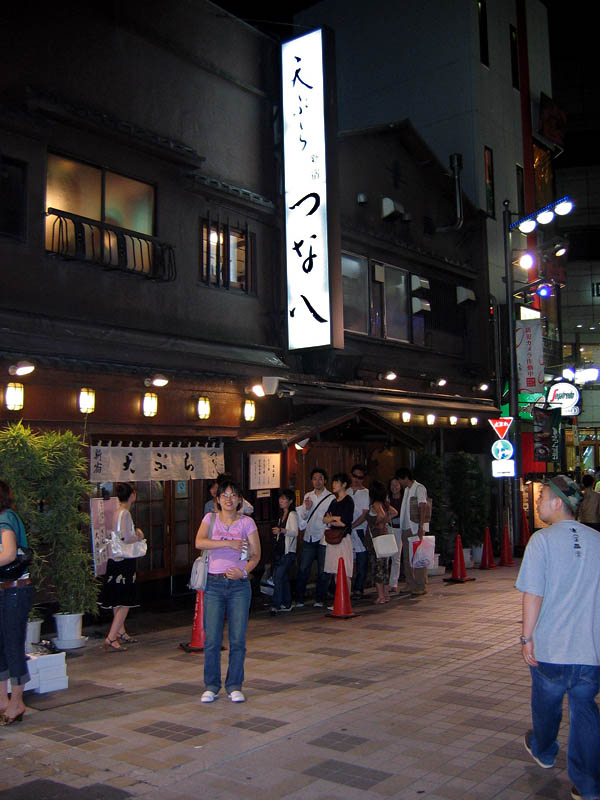 Hyunjin poses outside of the tempura restaurant. Notice the line of people waiting to get in. In the absence of experience, this is the best way to choose a place to eat—just go where all the locals go. And this place was indeed packed. We ate upstairs in relative piece, but downstairs, where they had a long bar, people were shoulder to shoulder.