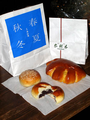 After wandering around Shinjuku for a while we returned to the ryokan to divvy up our loot—the two red bean-stuffed pieces of bread from Kimuraya (lower left) and a custard-filled pastry from Bakery Nakamura in Shinjuku. Bakery Nakamura originated the custard-filled pastry in Japan, so we had to give it a try. All three were excellent, and disappeared shortly after this photo was taken.