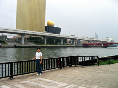 After leaving the Traditional Crafts Museum we walked to the Sumida River. Behind Hyunjin is the Asahi Beer Tower (on the left) and the Asahi Super Dry Hall with its “Golden Flame.” We did not know this at the time, of course, and simply dubbed it the “Golden Turd.”