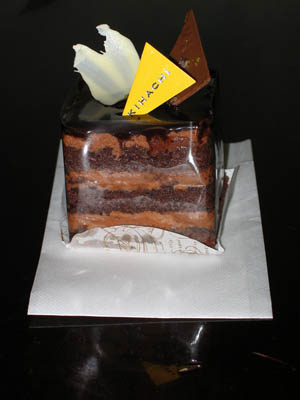 Part of relaxing in our room involved eating this piece of chocolate cake we bought at a cake shop in Ikebukuro Station. The station is massive and has quite a few shops, and an entire section is devoted to at least two dozen different cake shops and bakeries. The selections all looked very good, but they were bit on the pricey side. This chocolate cake seemed a good compromise, and it turned out to be very tasty.